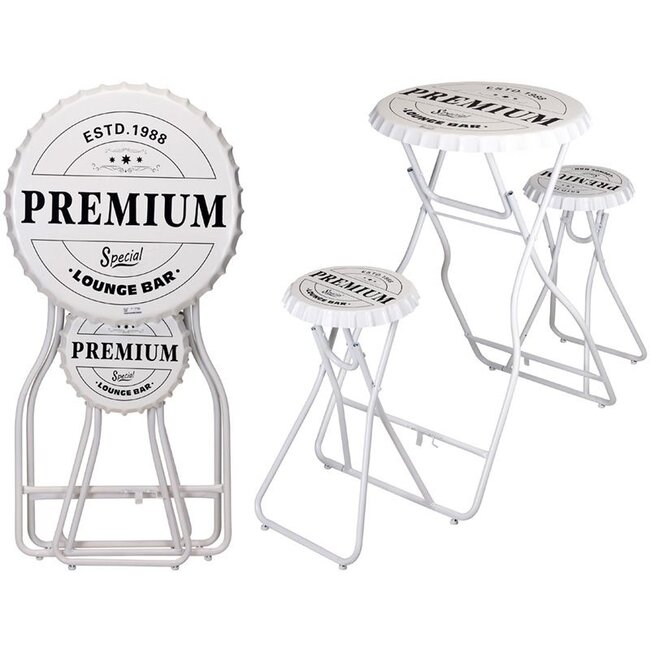 The bar table has a height of 101 cm and a diameter of 60 cm. When unfolded, the width of the table and stools is approx. 140 cm. The sturdy metal frame has a thickness of 20 mm. The total weight of the set is 12.4 kg, and it comes in white. Read more.