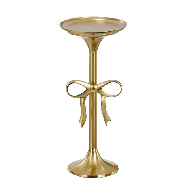 Op zoek naar een vleugje elegantie in huis? Deze gouden bijzettafel van Mica Decorations is een echte blikvanger. Het slanke ontwerp is gemaakt van gerecycled aluminium en verfijnd afgewerkt met een decoratieve strik: een stijlvol detail dat direct opvalt. De warme goudkleur past perfect bij zowel moderne als klassieke interieurs. Dankzij de hoogte van 57 cm en de diameter van 25 cm is deze bijzettafel ideaal naast een fauteuil, of als sokkel voor een plant of kunstobject. Een decoratief accent met karakter, voor wie houdt van uitgesproken details.
