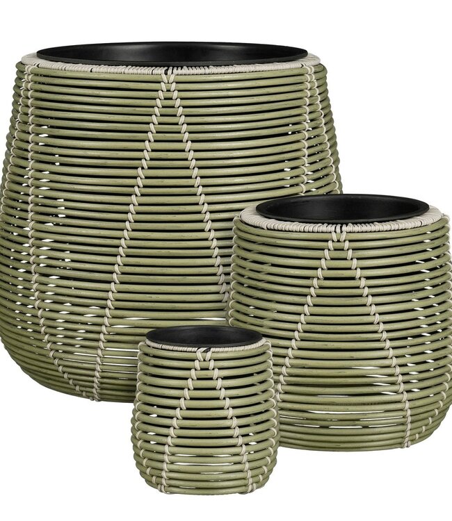 Met de Cancun bloempottenset van Mica Decorations geef je jouw buitenruimte een frisse en natuurlijke uitstraling. De lichtgroene kleur en gevlochten look met subtiele details passen perfect bij elke tuin of balkon.