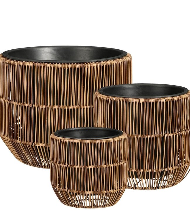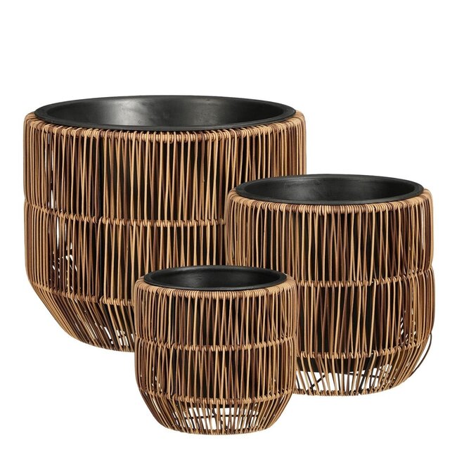 Geef je tuin, balkon of terras een warme en natuurlijke uitstraling met de Peta bloempotten set van Mica Decorations. Deze set van 3 bloempotten heeft een decoratieve, open structuur in donkerbruin en combineert een handgevlochten look met een strakke zwarte binnenpot.