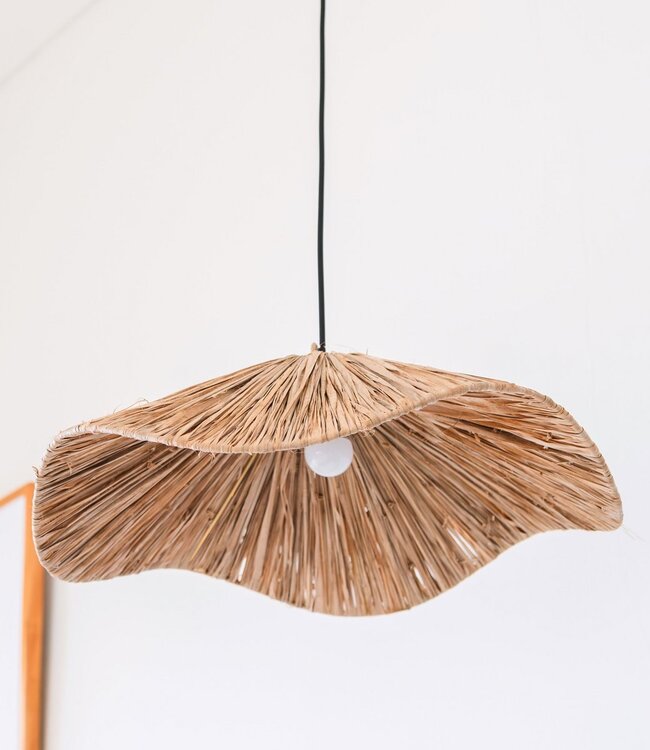 • Warme, gezellige sfeer: de strak geweven raffia lampenkap verspreidt zacht, warm licht, waardoor een ontspannen en uitnodigende sfeer ontstaat • Opvallende stijlupgrade: Tampah is een echt statement-stuk dat uw huis direct naar een hoger niveau tilt en een gedenkwaardig, persoonlijk tintje met een tropische flair toevoegt – alles met minimale inspanning • Veelzijdig design: de tijdloze golvende vorm sluit naadloos aan bij diverse interieurstijlen, van boho chic tot modern minimalisme • Eenvoudige installatie: De ingebouwde ring voor de lamphouder zorgt voor een veilige en stabiele opstelling • Duurzame natuurlijke materialen: hoogwaardige raffiavezels geweven rond een stevig metalen frame maken deze lampenkap zowel lichtgewicht als duurzaam • 100% handgemaakt en eerlijke handel • Bliksemsnelle verzending, de verpakking is plasticvrij