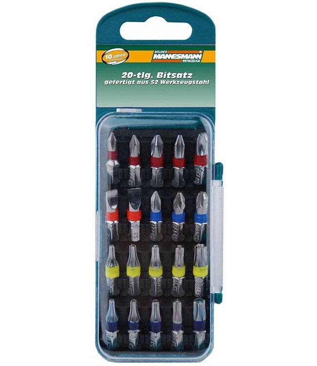 Brüder Mannesmann Bitset (20 dlg) in cassette. Set bestaat uit 20 verschillende bits (28mm) met kleurmarkering. Materiaal: S2 staal. Verpakt in handige cassette met zichtvenster. Read more.