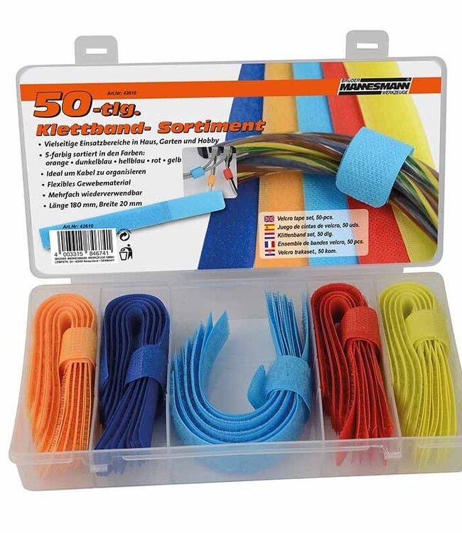 Schep orde in je kabeljungle met deze meerkleurige klittenbandset van Brüder Mannesmann. Hij wordt geleverd in een handige transparante opbergbox.