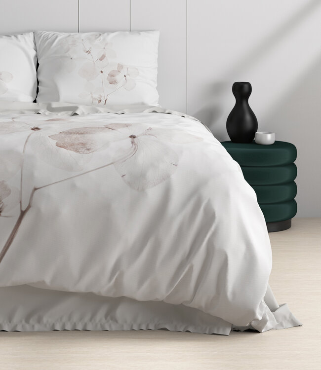 Dreamhouse Wild Dira dekbedovertrek van 100% katoen-satijn (T200) — luxueus zacht en ademend. Het subtiele wit-taupe bloemendessin geeft je slaapkamer een frisse, elegante uitstraling en is makkelijk te combineren. Voorzien van extra lange instopstrook over de volledige breedte met drukknopen en bijpassende kussenslopen (60x70 cm) met hotelsluiting. Maat 140x220 cm (technische lengte 240 cm). Kleurvast door reactief wassen, antiallergisch, kreuk- en strijkvrij. Machinewasbaar tot 60°C en geschikt voor de droger. Superzachte satijnbinding voor comfort elke nacht — stijlvol verpakt, direct klaar om cadeau te geven of je slaapkamer te verfraaien.