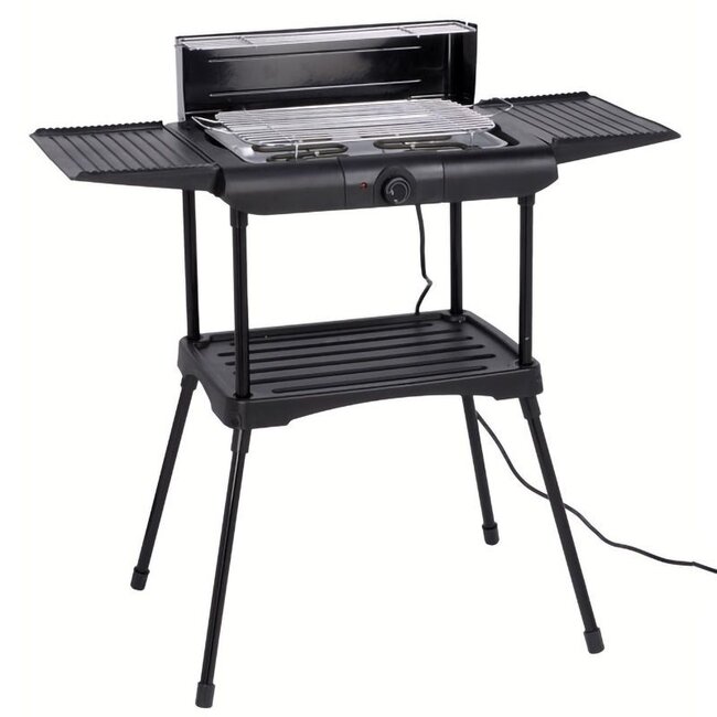 Excellent Electrics Elektrische barbecue (staand model) Een elektrische barbecue met 2 zijtafels en extra plateau op voet. Afmeting: lengte: 87cm, diepte: 46cm, hoogte: 86cm. 230V / 50Hz. Read more.