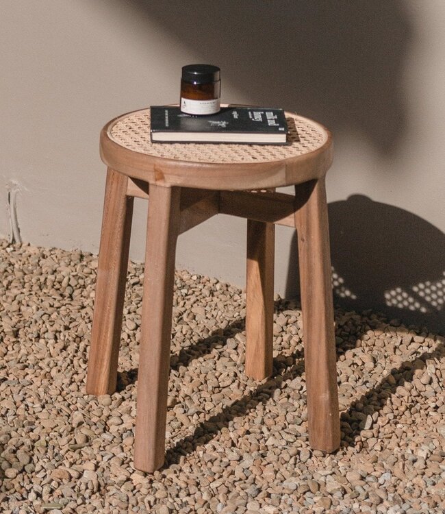 Houten kruk CARAMIN gemaakt van Trembesi met een zitvlak van geweven rotan