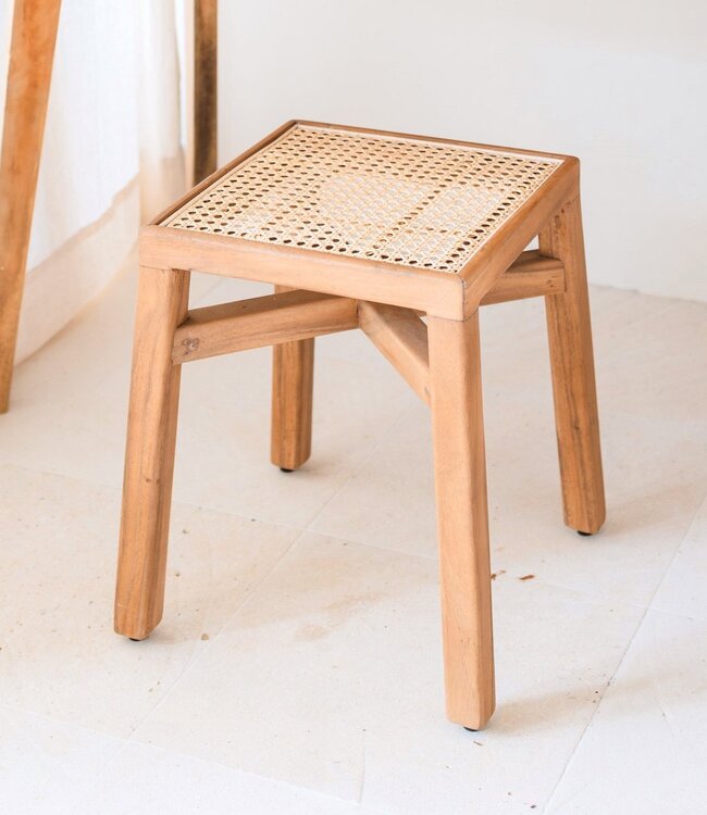 De kruk maakt niet alleen indruk met zijn uiterlijk, hij is gebouwd om lang mee te gaan. Hij is gemaakt van stevig trembesihout en strak geweven rotan en is ontworpen voor dagelijks gebruik. Het gladde, geweven oppervlak biedt natuurlijk comfort en ademend vermogen, waardoor het perfect is voor dagelijks gebruik, of het nu als zitplaats of als decoratiestuk is.