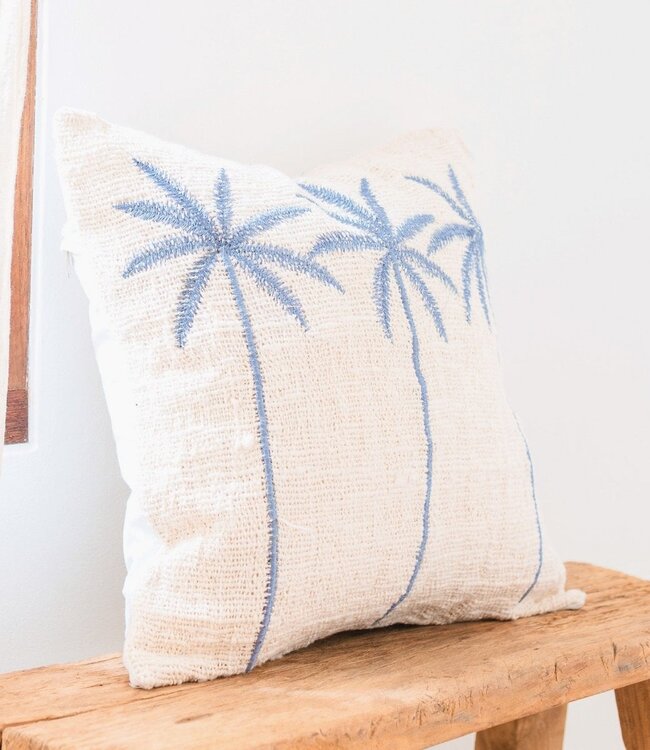 Het lichtblauwe palmpatroon op onze handgemaakte Anarka kussenhoes brengt een vleugje tropische charme in je huis en roept de ontspannen sfeer van een strandvakantie op. Of je deze geborduurde decoratieve kussensloop nu op een bank, fauteuil of bed plaatst, hij vult lege ruimtes met stijl, waardoor elke kamer meteen gezelliger en persoonlijker aanvoelt. Het is uw snelle ticket voor het creëren van een sereen, stijlvol toevluchtsoord thuis.