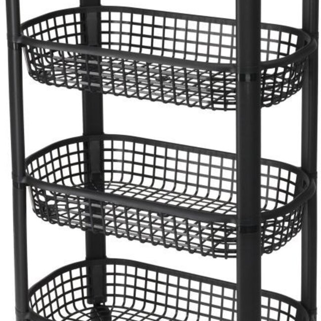 This kitchen trolley features four tiers with spacious baskets and four wheels for easy mobility. Made of durable plastic (PP) and finished in sleek black.