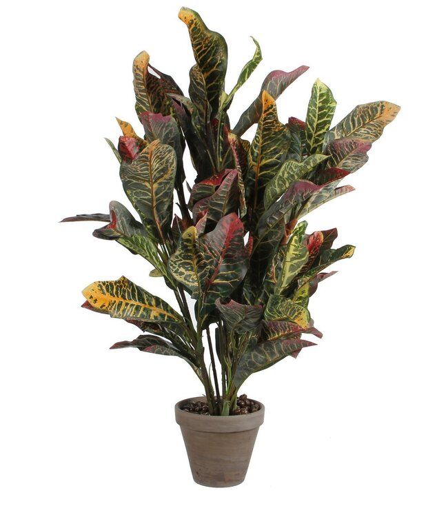 Klaar om zorgeloos te genieten? De kunstplanten van Mica Decorations zijn niet van echt te onderscheiden, maar hebben geen enkel onderhoud nodig. Deze Croton valt op door de kleurrijke bladeren. Het blad wordt gesierd met gele en rode accenten die natuurlijk in het groen overlopen. De plant is al gemodelleerd en stevig verankerd in een terracotta pot met basalt grijze pigmenten. Na aankoop kan de plant dus direct worden neergezet, of gebruik de bijgeleverde pot als stevige basis voor een sierlijke overpot. Combineer hem met andere kunstplanten en -bloemen uit de collectie en breng meer groen in huis. De afmetingen van de Croton zijn H73 x Ø40 cm. Gewicht: 1070g kleuren: Groen, Groen