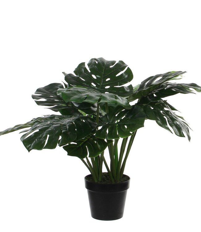 Klaar om zorgeloos te genieten? De kunstplanten van Mica Decorations zijn niet van echt te onderscheiden, maar hebben geen enkel onderhoud nodig. De Monstera, oftewel gatenplant, is misschien wel de meest populaire kunstplant uit de collectie. De plant met zijn karakteristieke bladeren zorgt voor een botanische sfeer. Het opvallende blad van deze Monstera heeft een satijnzachte glans, net zoals de planten uit de natuur dat hebben. De plant is 60 cm hoog en stevig verankerd in een zwarte kunststof pot, wat een perfecte basis is voor in een mooie overpot. Combineer hem met andere kunstplanten en -bloemen uit de collectie en breng meer groen in huis. Gewicht: 2250g kleuren: Groen