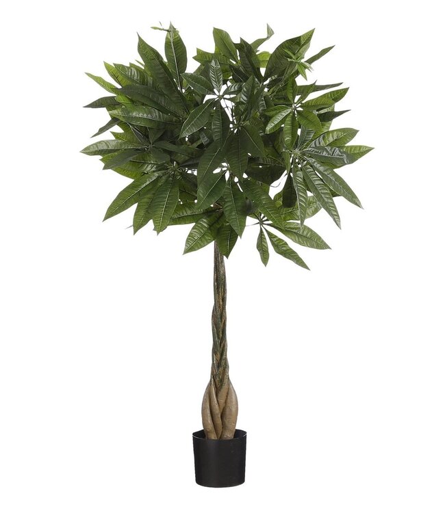 Klaar om zorgeloos te genieten? De kunstplanten voor binnen van Mica Decorations zijn niet van echt te onderscheiden, maar hebben geen enkel onderhoud nodig. De Pachira, ook wel Watercacoa of Geldboom genoemd, staat in het Verre Oosten symbool voor welvaart en geluk wordt vaak als cadeau gegeven. Deze kunstvariant is een leuk alternatief, bijvoorbeeld voor iemand zonder groene vingers. De groene bladeren zijn uitgevoerd in verschillende maten en groentinten. Net echt! Daarnaast is de gevlochten stam gemaakt van echt hout. De plant staat in een zwarte, kunststof pot die gemakkelijk in een sierlijke bloempot gezet kan worden. Voor gebruik moet de plant nog in model worden gebracht. De afmetingen zijn ca. H80 x Ø60 cm.
