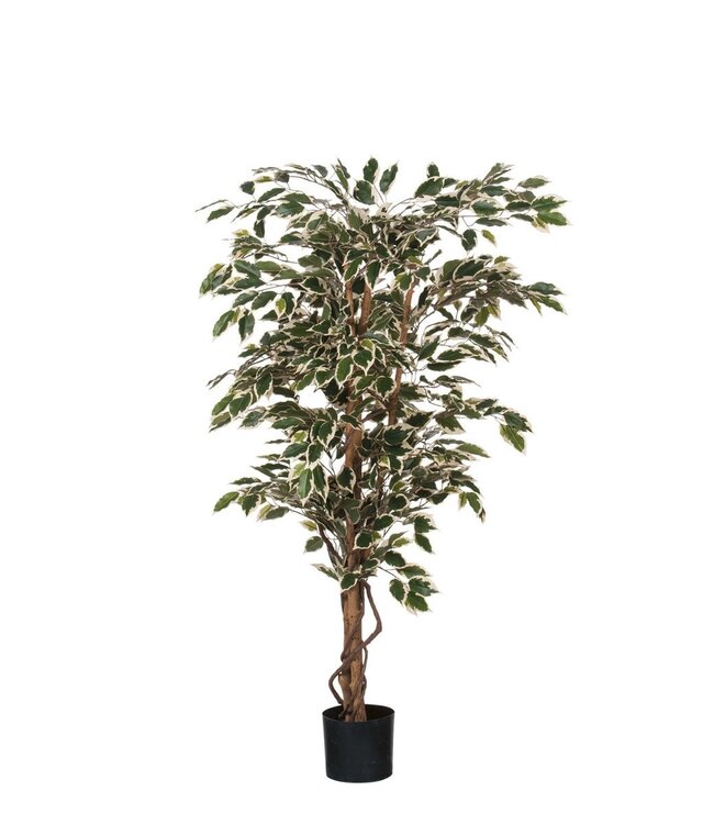 Klaar om zorgeloos te genieten? De kunstplanten voor binnen van Mica Decorations zijn niet van echt te onderscheiden, maar hebben geen enkel onderhoud nodig. Met deze Ficus haal je daarnaast direct meer groen in huis. De frisse, speelse blaadjes zijn voorzien van een tot in detail nagemaakte tekening met lichte randen. Door het blad uit te voeren in verschillende maten en groentinten lijkt de plant net echt! Zeker in combinatie met de houten stam. De kunstplant staat stevig verankerd in een zwarte kunststof pot, maar moet voor gebruik nog in model worden gebracht. Zet hem na het uitvouwen zo neer of geef een eigen twist aan deze plant door hem in een mooie overpot te plaatsen. Leuk om te combineren met andere kunstplanten en -bloemen uit de collectie! Eenmaal uitgebouwen meet de plant H150 x Ø75 cm. Gewicht: 4000g kleuren: Groen