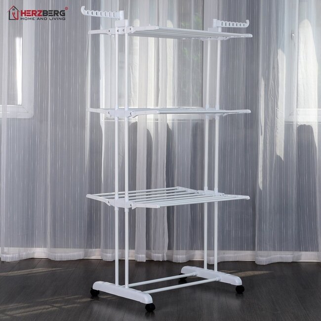 This versatile folding hanging rack is the ideal solution for drying and organizing your laundry and clothes. Made of high quality, durable steel with a protective powder coating against rust and corrosion. Read more.