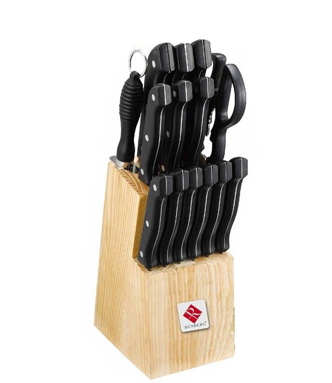Renberg 15-delig Messenblok Dit 15-delige houten messenblok wordt geleverd inclusief: - schilmesje, voorhet schillen en snijden van fruit en zachte groenten (lemmet 8 cm) - uitbeenmes (l... Read more.