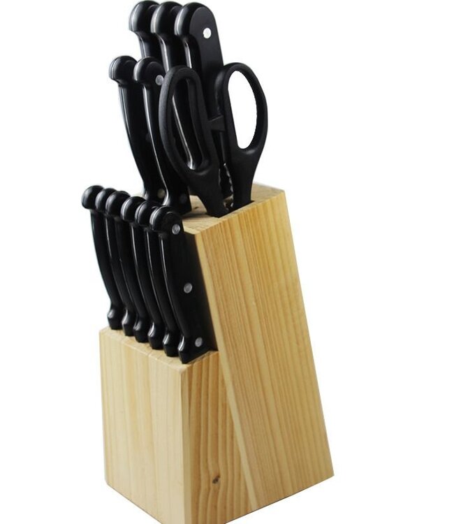 budget messenset in houtenblok perfect voor studentenhuizen, vakantiehuisjes of buitenfeestjes 15-delig houten blok broodmes schilmes koksmes uitbeenmes trancheermes universeel keukenmes ... Read more.
