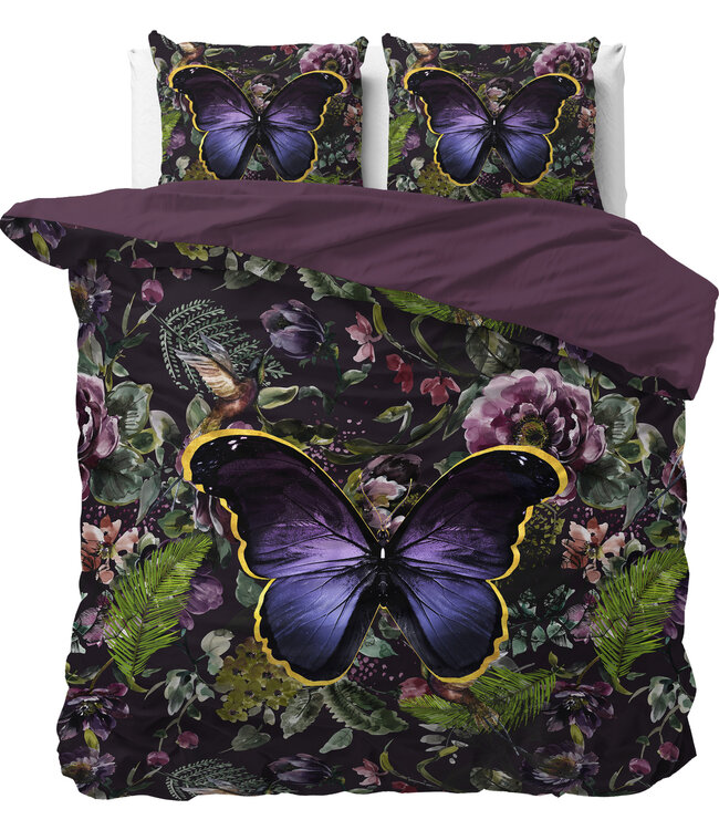 Dreamhouse Wild Mosani katoen-satijn dekbedovertrek — luxe, zacht en tijdloos. Dubbelzijdig digitaal bedrukt; voorzijde rijk bloemen- en vlinderpatroon op zwarte achtergrond met paarse accenten, achterzijde effen zwart. Gemaakt van 100% katoen-satijn T200: ademend, absorberend en extra zacht door satijnbinding. Voorzien van doorlopende instopstrook (20 cm) met drukknopen en inclusief kussenslopen (60x70 cm) met hotelsluiting. Afmeting 240x220 cm. Hypoallergeen, kreuk- en strijkvrij, wasbaar op 60°C en geschikt voor de droger. Luxe verpakking. Ideaal voor wie een elegante, comfortabele slaapkamer wil met duurzame kwaliteit en een trendy print.