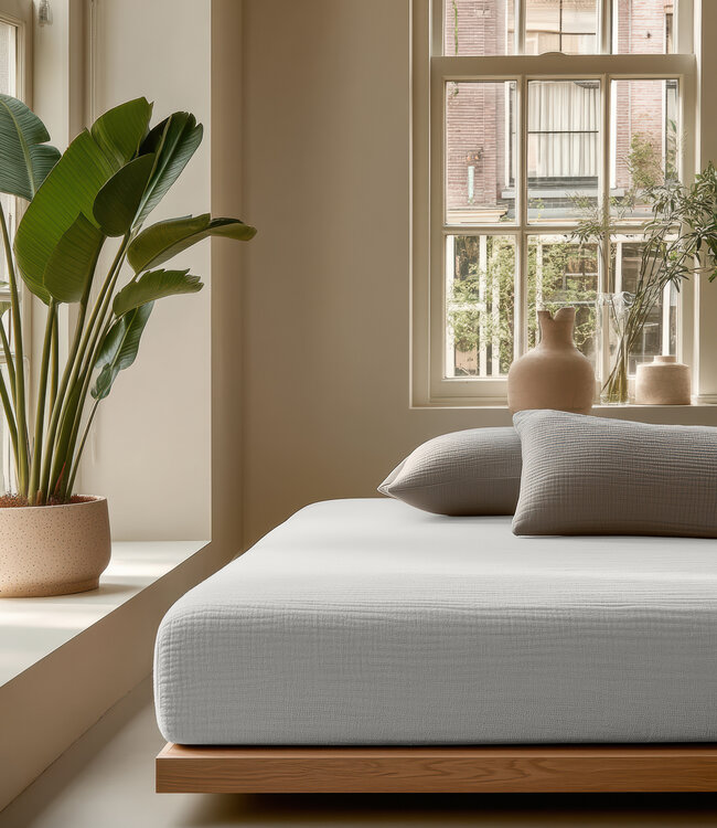 Dreamhouse stretch-hoeslaken 90×200 cm (hoekhoogte 30 cm) in crème — luxe, ademend en heerlijk zacht. Bovenlaag van katoen mousseline en onderzijde 100% katoen T180 (220 GSM) voor comfort en duurzaamheid. Anti-huisstofmijt en anti-allergisch; geschikt voor boxsprings en matrassen. Elastische pasvorm voor een rimpelvrije afwerking. Wasbaar op 40°C, drogerbestendig en inclusief 2 jaar fabrieksgarantie. onderhoudsvriendelijk en perfect voor volwassenen die zoeken naar rust en kwaliteit.