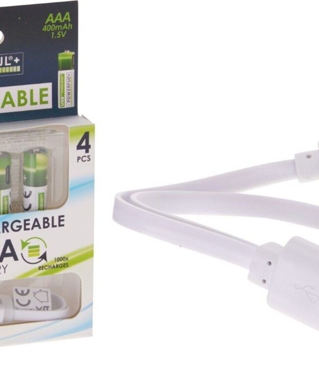 4 pcs AAA Lithium-Ion USB 400mAh/600Mwh current charging: 5V/90mA full charge: 1/1.5 hours connector: USB-C flashing led when charging bright led when fully charged max 1000 charges Read more.
