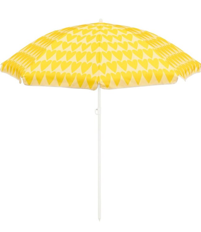 BeschrijvingZorgeloos genieten van een zomerdag met deze praktische strandparasolGeen parasolvoet nodig dankzij het puntige uiteinde, ideaal voor strand of parkInclusief handige draagtas voor eenvoudig transport en beschermingGemaakt van stevig polyester en een stalen stok voor optimale stabiliteitFrisse geeltinten en een hartjesprint zorgen voor een speels retro accentGemaakt van polyester en staal en met een hoogte van 180 cm en een diameter van 160 cm