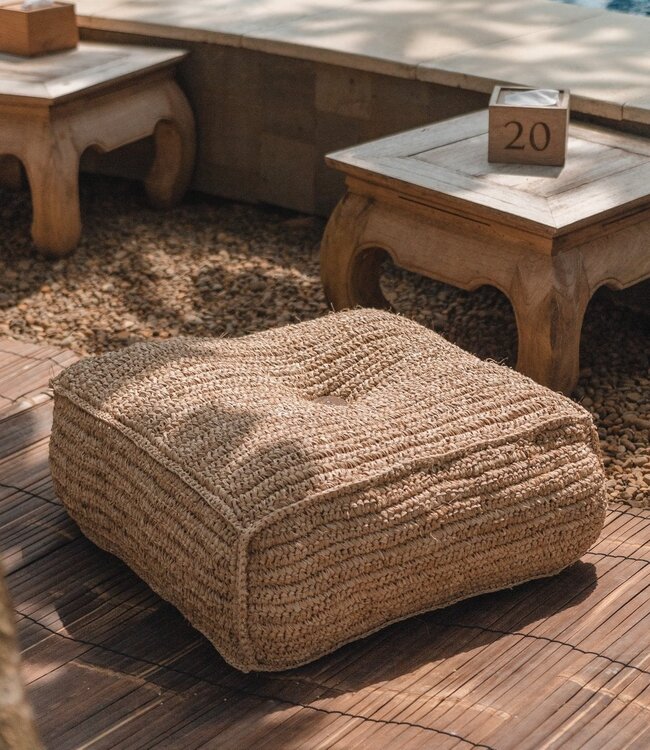 Onze betoverende Padar zitpoef is ingewikkeld met de hand geknoopt uit de natuurlijke vezel raffia. De vulling van kokosvezels en regionaal geteeld katoen draagt ​​niet alleen bij aan de bijzonder dikke en hoogwaardige uitstraling, maar zorgt ook voor een heerlijk zacht zitgevoel.