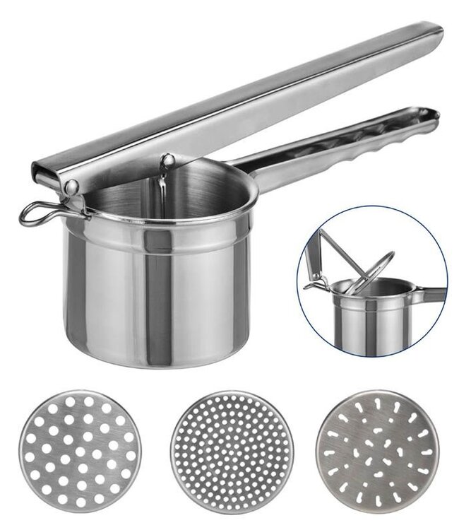 eenvoudig te bedienen door de hefboomwerking materiaal : RVS, 304 stainless steel afmeting: 29 x 9 x 13 cm met 3 verschillende structuurschijven: grof, middel, fijn geschikt voor o.a. aardappel... Read more.