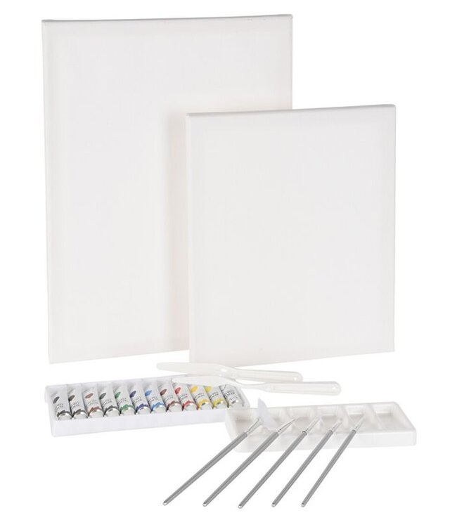 schilderset 2 canvasdoeken (25 x 30 cm & 30 x 40 cm) 12 tubes acrylverf (12ml) 5 kwasten verfpalet 19 x 7 x 1,5 cm (l x b x h) 2 schildersmessen gewicht: 563 gram Read more.