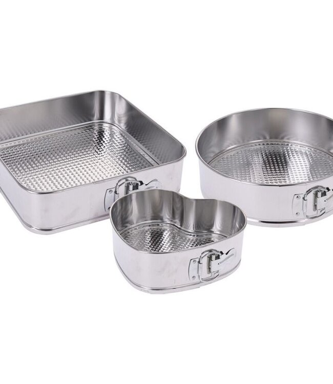 Met deze springvormen bak je de lekkerste taarten en cakes. In deze set zitten maar liefst 3 bakvormen. 1 ronde, 1 vierkante en 1 hartvormige. Dankzij de uitneembare bodems zijn de springvormen makkelijk schoon te maken. De afneembare randen zorgen ervoor dat de zelfgebakken taarten ook rondom gedecoreerd kunnen worden. Na het bakken zijn de vormen goed op te bergen, gezien ze in elkaar geplaatst kunnen worden.