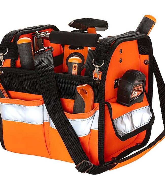 Materiaal: solide neon-oranje 600D Polyester Brede zilverkleurige reflectiestreep op beide zijden Extra ruim open opbergcompartiment Metalen draagbeugel met anti-slip greep Versterkende metalen... Read more.