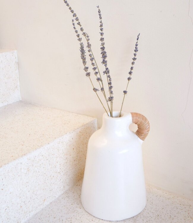 Vaas Witte kleine decoratieve vaas voor gedroogde of verse bloemen, handgegoten uit klei met rotan handvat SANA
