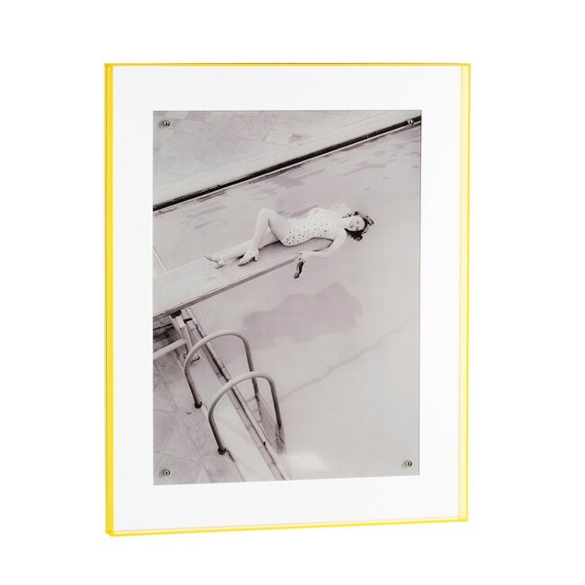 Bring timeless elegance to your walls with this unique wall decoration from Mica Decorations. The artwork features a stylish woman on a diving board and creates a stunning cube effect when hit by light. The modern frame with a playful yellow edge adds a fresh look and fits effortlessly in both classic and contemporary interiors. Ideal for living rooms, bedrooms, or hallways.