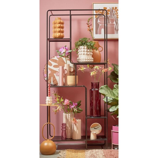 BeschrijvingStellingkast met open vakkenGemaakt van stevig materiaal en afgewerkt in stoere kleurMet 5 planken in verschillende hoogtesModerne open kast met vakkenIdeaal om jouw favoriete woonaccessoires te tonen!In het zwart en gemaakt van ijzer