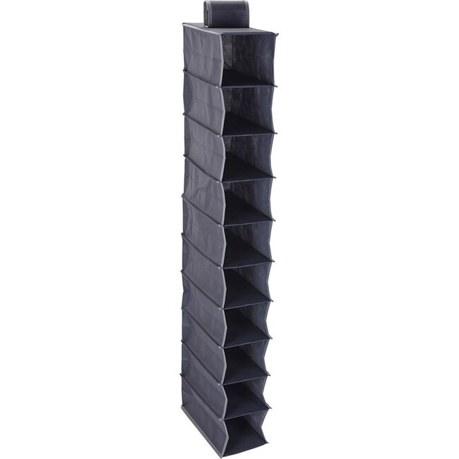 Wardrobe organizer with 10 spacious compartments is perfect for neatly storing shoes, clothes, towels, and other accessories. Thanks to its hanging design and sturdy loop, it easily attaches to a closet rod. Read more.