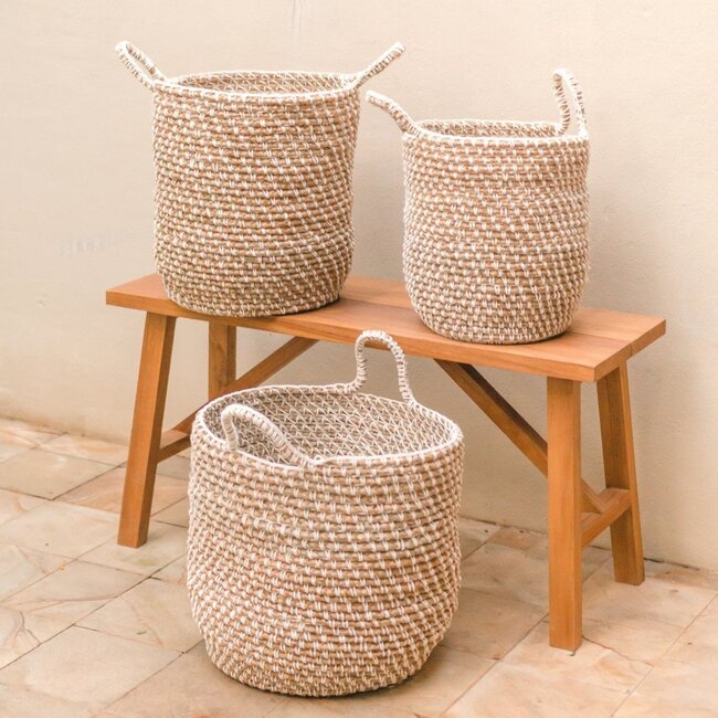 • 26 (S), 30 (M) of 36 (L) cm diameter, 30 (S), 34 (M) of 36 (L) cm hoog • gemaakt van stevige, duurzame bananenvezel met een prachtig katoenen koordpatroon • met praktische handvatten, perfect als opbergmand of wasgoed • gratis DHL verzending binnen Duitsland, de verpakking is plasticvrij • 100% handgemaakt en eerlijke handel • gratis verzending en 10% korting op alle bestellingen in onze Orderchamp-winkel boven € 350,-