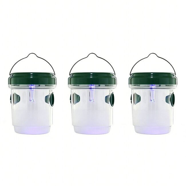 set van 3 wespenvallen twee invlieggaten solar UV-licht (blauw) stevige schroefdop ophangbeugel staand en hangend te gebruiken regenbestendig diameter: 9 cm hoogte: 12 cm materiaal: PP, ku... Read more.