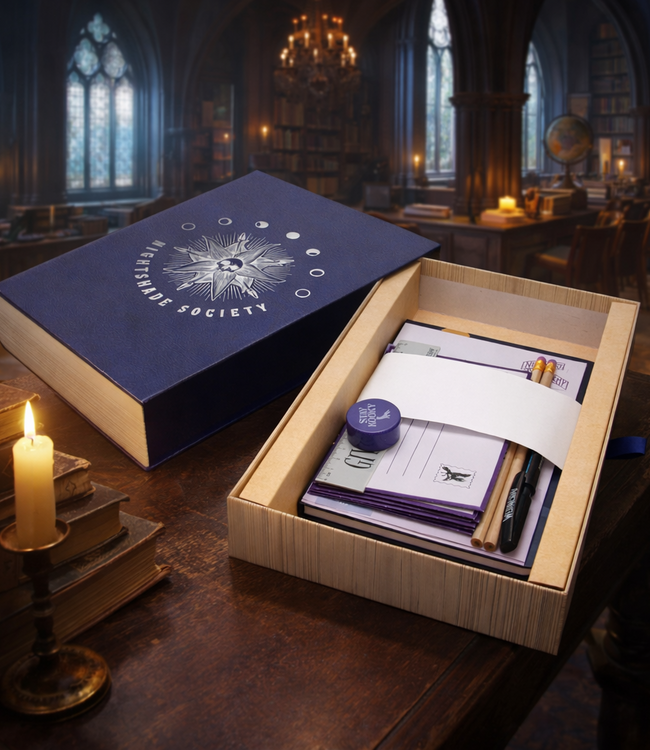 De Nightshade Society Keepsake Book Box Set is een exclusieve geschenkdoos die van bijzonder belang zal zijn voor zowel estheten als verzamelaars. De set is voorzien van koninklijk paars en gedetailleerd reliëf van een mystiek symbool, omgeven door sprankelende accenten die het ontwerp benadrukken. Binnenin bevindt zich een zorgvuldig geselecteerde verzameling memorabilia, vervaardigd met veel aandacht voor detail. De set wordt aangevuld met een selectie briefpapier dat het thema "Wednesday" en "Nevermore Academy" volgt, waaronder een donkerblauw dagboek, een vel stickers, twee potloden en notitieblokken, allemaal kunstig ontworpen met gotische en speelse elementen. Breedte: 21cm Hoogte: 29.7cm Lengte: 5.5cm Gewicht: 738g kleuren: Blauw, Zwart, Paars
