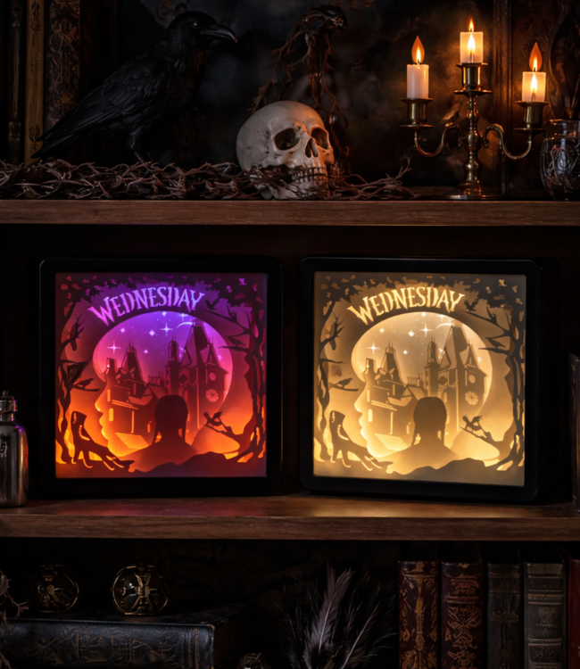 De "Wednesday Layer Light" is een stijlvolle LED-lamp die indruk maakt door zijn unieke design en veelzijdige functionaliteit. Deze lamp kan worden gevoed door zowel batterijen als een USB-C-kabel, waardoor hij flexibel en mobiel is. Met twee verschillende lichtinstellingen kun je voor elke gelegenheid de perfecte sfeer creëren. Op de verpakking staat een charmant silhouettafereel met bomen en een grote maan op de achtergrond, wat de sfeervolle verlichting van deze lamp benadrukt. Hij is bijzonder geschikt voor fans van de serie 'Wednesday' en voor iedereen die van themaverlichting houdt.