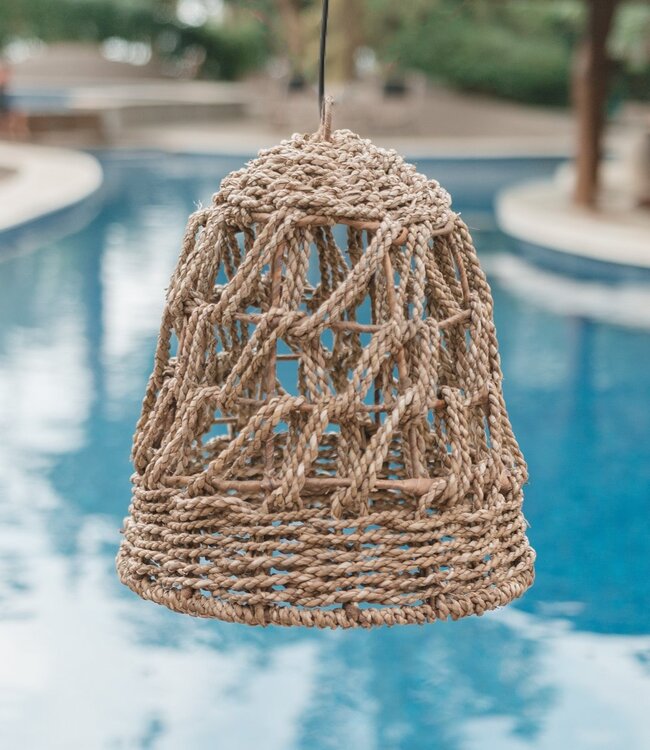 De robuuste lampenkap van zeegras wordt geleverd zonder snoer en lampen, maar je kunt deze eenvoudig in de gewenste maat en kleur kopen in elke bouwmarkt.