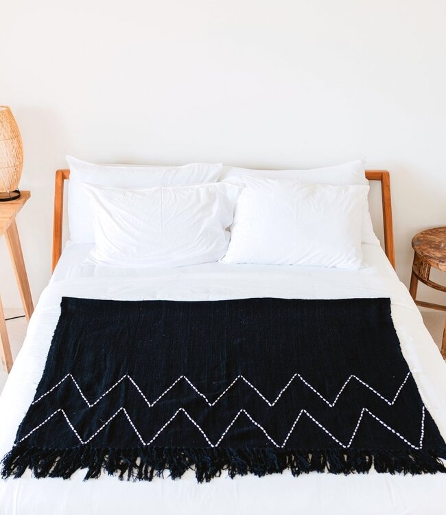• Gezellig comfort: de zachte katoenen stof is ademend en biedt uitzonderlijk comfort • Opvallend ontwerp: de diepzwarte plaid met wit zigzagborduurwerk en decoratieve franjes maakt een krachtig stijlstatement • Veelzijdig decoraccent: Of het nu over een bank of fauteuil wordt gedrapeerd of als sprei wordt gebruikt, dit plaid van 140 x 200 cm past naadloos in elke omgeving • Duurzame kwaliteit: Gemaakt van hoogwaardig, lokaal geproduceerd katoen, minimaal verwerkt behalve de zwarte kleurstof, en handgeweven op traditionele weefgetouwen • Perfect te combineren: vormt een prachtige aanvulling op onze handgeweven kussenhoezen om een samenhangende en uitnodigende huiselijke sfeer te creëren • 100% handgemaakt en eerlijke handel • Bliksemsnelle verzending, de verpakking is plasticvrij