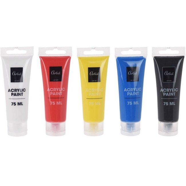 Set van 5 grote tubes van 75ML acrylverf in de meest gebruikte kleuren.