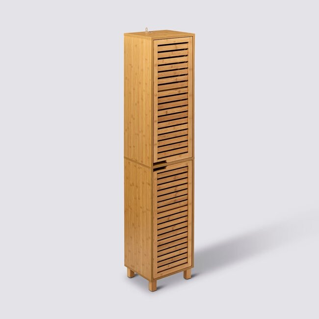Ga voor een warme toets in jouw badkamer met de Sicela kolomkast van5five. Deze stijlvolle badkamerkast is vervaardigd van duurzaam bamboe en beschikt achter de twee deuren over vier handige opbergniveaus. Gebruik de kolomkast om je verzorgingsproducten, handdoeken en andere badkamerspullen netjes en overzichtelijk op te bergen. De sicela kast is daarmee een praktische én elegante toevoeging aan jouw badkamerinterieur. Met een breedte van 33 cm, diepte van 28 cm en hoogte van 168 cm neemt hij niet veel ruimte in, maar biedt hij wel veel opbergruimte.