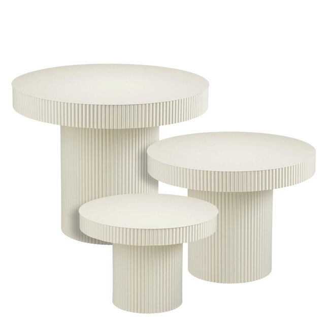 Het ronde ontwerp met subtiele verticale ribbels geeft de tafels een speels maar strak karakter. Ideaal om te gebruiken als bijzettafel, salontafel of presentatieplek voor decoratie.