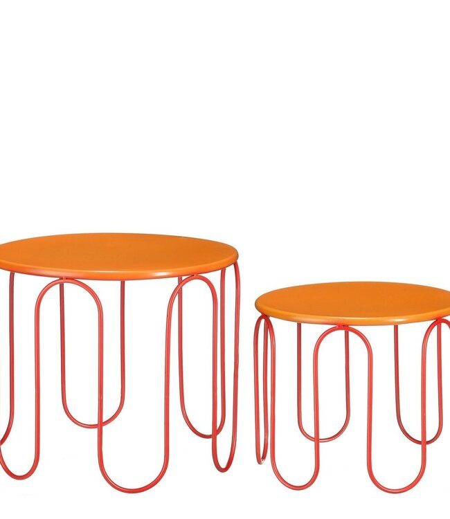 BeschrijvingSet van twee tafeltjes met een gedurfd design voor een opvallend accent in je interieurVeelzijdig te gebruiken als duo of apart in verschillende ruimtesStevig ontwerp dat eenvoudig schoon te maken isCompact formaat dat moeiteloos past in woonkamer, hal of slaapkamerDonkeroranje en lichtoranje kleurencombinatie voor een warme en stijlvolle uitstralingGemaakt van ijzer met de afmetingen H39,5 x Ø46 en H32 x Ø38 cm