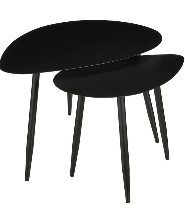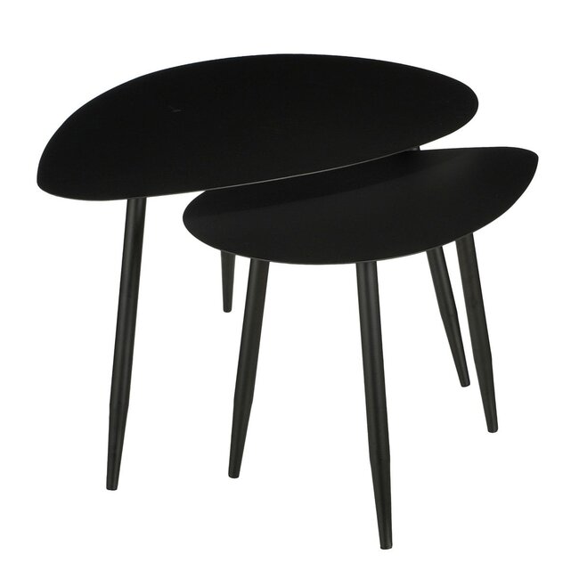 De bijzettafels van Mica Decorations passen door het strakke, moderne design al snel in het interieur. Bijvoorbeeld als koffietafel naast een stoel, als plantentafel of als salontafel. BeschrijvingSet van 2 tafels met een uniek druppelvormig bladStrak en modern design past in elk interieurVeelzijdig te gebruiken als bijzet-, koffie- of plantentafelSlim in elkaar te schuiven voor flexibel gebruikMinimalistische uitstraling, perfect te stylen met decoratieDe grote tafel heeft een lengte van 80 cm, breedte van 60 cm en hoogte van 47 cm en de kleine tafel heeft een lengte van 60 cm, een breedte van 40 cm en een hoogte van 42 cm Gewicht: 6500g kleuren: Zwart, Zwart