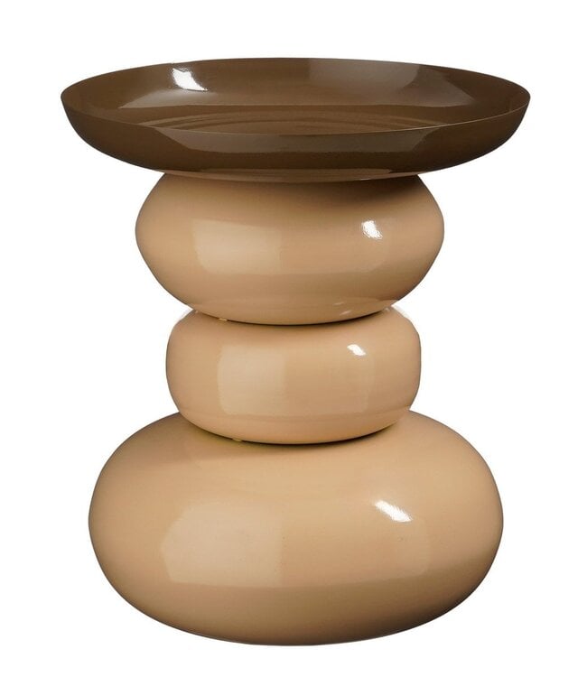 Geef je interieur een opvallend en stijlvol accent met de Zita bijzettafel van Mica Decorations. Deze bijzettafel heeft een speels, rond design en is uitgevoerd in een elegante combinatie van crème en bruin. De glanzende afwerking en gelaagde vorm geven de tafel een decoratief karakter dat direct in het oog springt. Dankzij het compacte formaat is hij geschikt als bijzettafel naast de bank of fauteuil, of als podium voor woonaccessoires. De tafel is handgemaakt, wordt voorgemonteerd geleverd en is stevig en praktisch in gebruik.