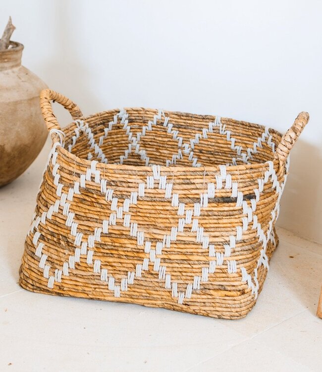 Breng natuurlijke elegantie in huis met onze handgeweven Gandaria-mand. De stijlvolle combinatie van rijke, natuurlijke bruine bananenvezels en opvallende witte katoenen accenten voegt een vleugje kustcharme toe aan elke kamer. Deze vierkante mand houdt niet alleen de boel netjes, maar creëert ook een rustige, gastvrije sfeer – perfect om je woonruimte te verfraaien.