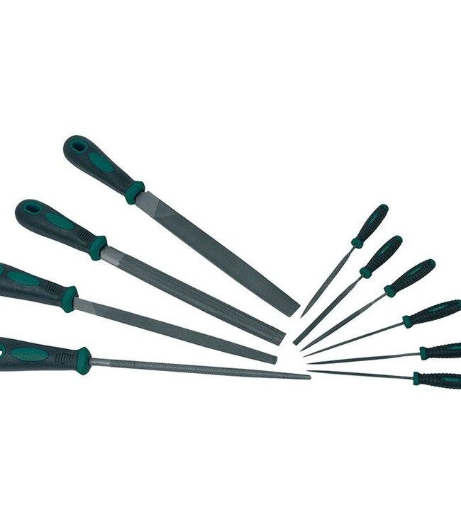 Brüder Mannesmann Vijlenset (10 dlg) Green Line, dus hoge kwaliteit. Set bevat: 4 Werkplaatsvijlen: -200mm., -Dubbel gekapt. -Driehoek, rond, halfrond, vlakstom... Lees meer.