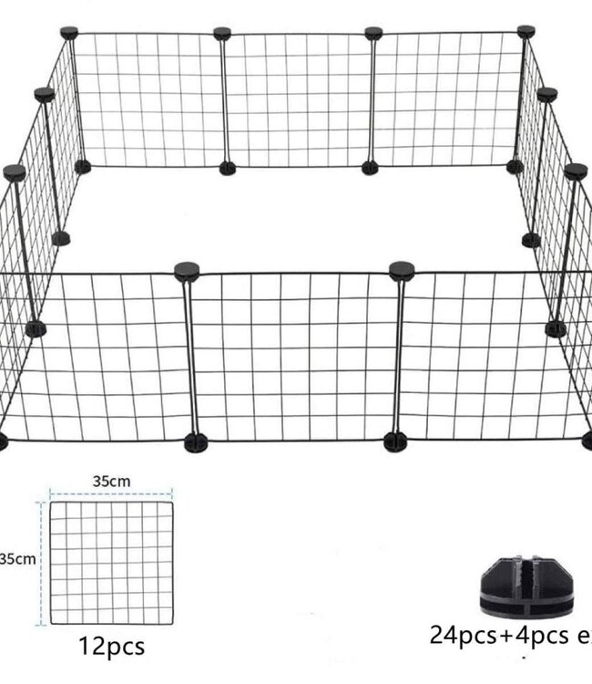 voor kleine huisdieren zoals puppy's, konijnen, cavia's 105 x 105 cm 12 metalen panelen van 35 x 35 cm makkelijk te bevestigen met de meegeleverde connectoren modulair, dus je kan zelf je eigen... Lees meer.