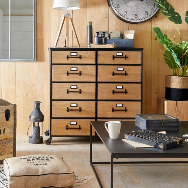 - Vintage fabriekssfeer: De metalen handvatten van de lades versterken de industriële, retro uitstraling en maken het openen en sluiten van de lades makkelijk.