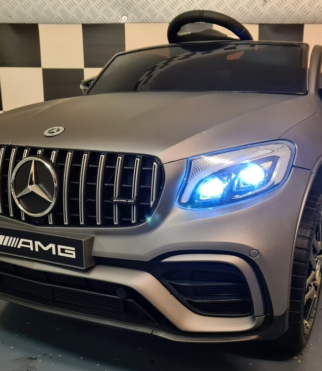 Mercedes GLC 63 AMG elektrische kinderauto 12V, 2.4G afstandsbediening, matgrijs. Voor kinderen vanaf 3 jaar (let op kleine onderdelen). Uitgerust met rubberen banden, leren stoel en verlichting — realistische rijervaring, veilig en stijlvol. Lees meer.